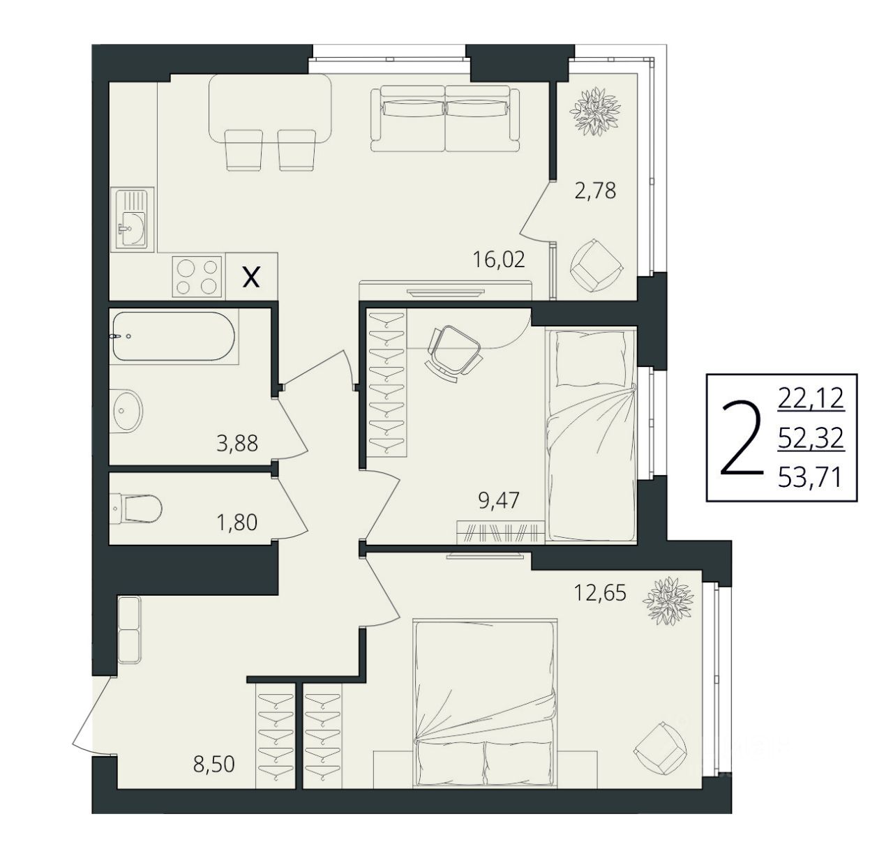 Общая площадь54,1 м2