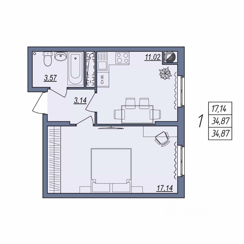 Общая площадь34,87 м2