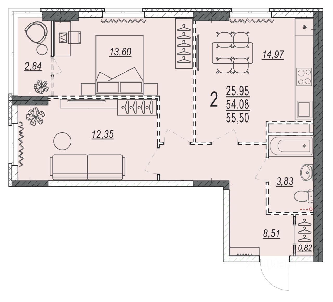 Общая площадь55,5 м2