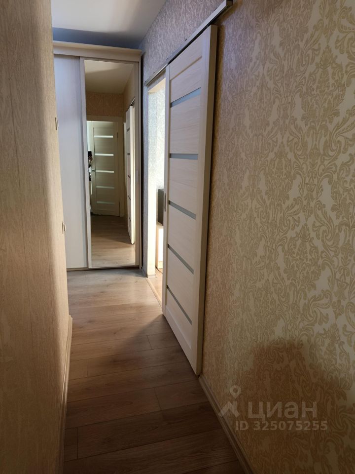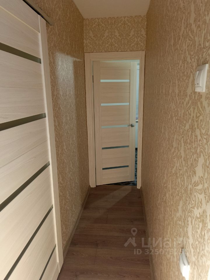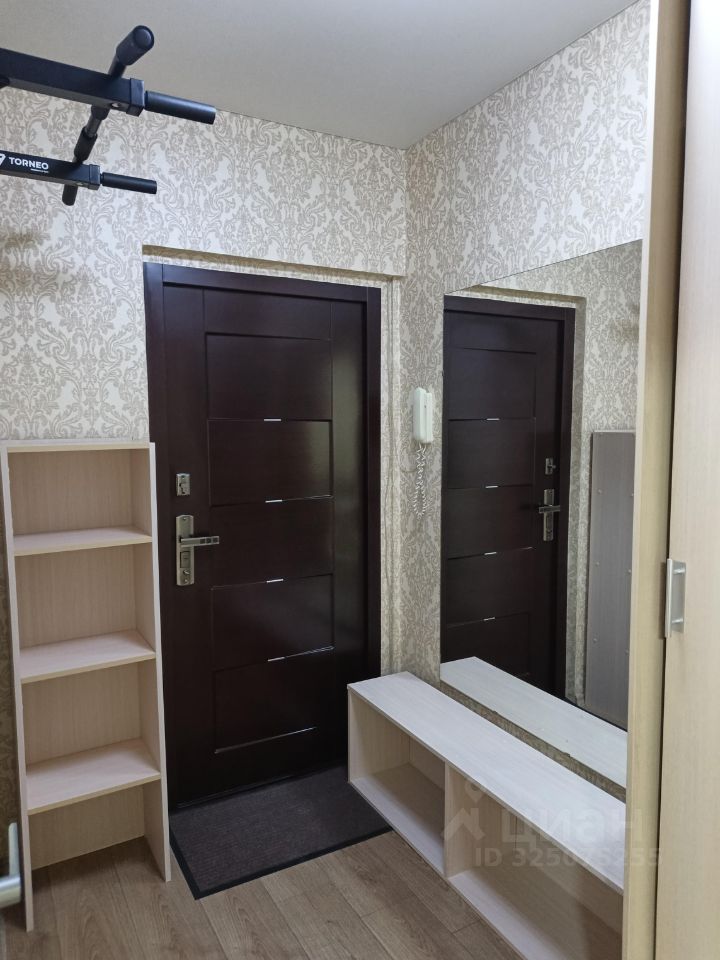 Коридор площадью 6,3 кв. м. В коридоре остается шкаф-купе с зеркалом, большое зеркало на стене, полка для обуви, стеллаж, турник, потолочный светильник, коврики. На стенах - обои, пол - ламинат (Egger, 4-фаски, толщина 13 мм для коммерческих помещений), потолок - натяжной потолок, белый, матовый.
