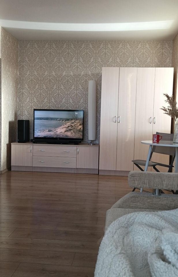 Жилая комната площадью 18,9 кв. м. с инфракрасным теплым полом на площади около 12 кв. м. В комнате остается раскладной диван, кресло-кровать, стол со стульями, 2 распашных шкафа, тв-тумба, жалюзи, тюль, напольный светильник, ваза с декором, потолочный светильник. На стенах - обои, пол - ламинат (Egger, 4-фаски, толщина 13 мм для коммерческих помещений), потолок - натяжной потолок, белый, матовый, окна - пластиковые.