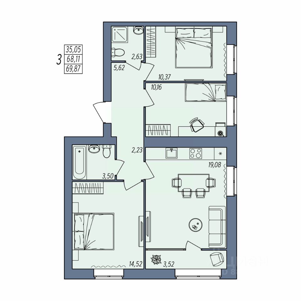Общая площадь69,87 м2