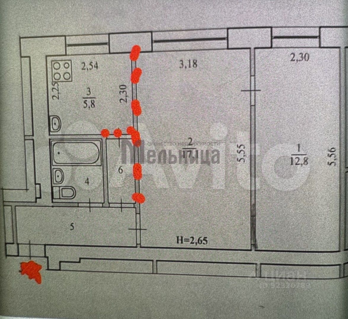 Общая площадь: 45 кв. м. Площадь комнат: 17,1+12,8 кв.м. Кухня: 6 кв.м. Высота потолков — 2.65 метра.