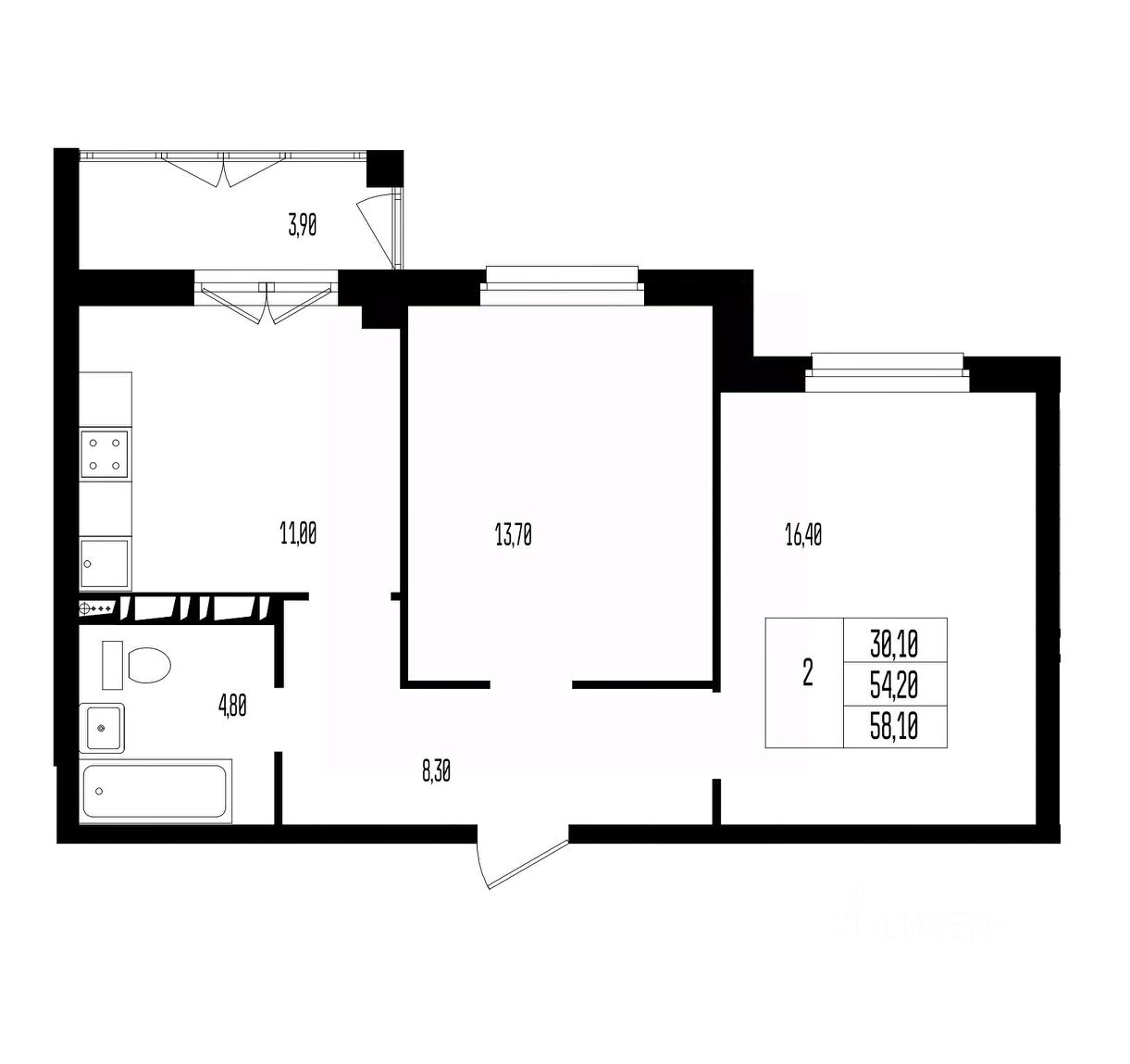 Общая площадь58,1 м2