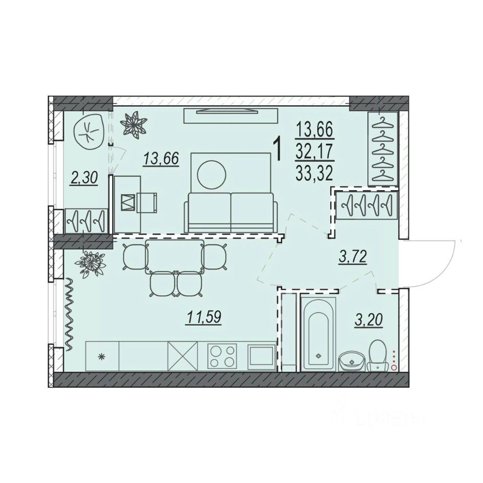 Общая площадь33,32 м2