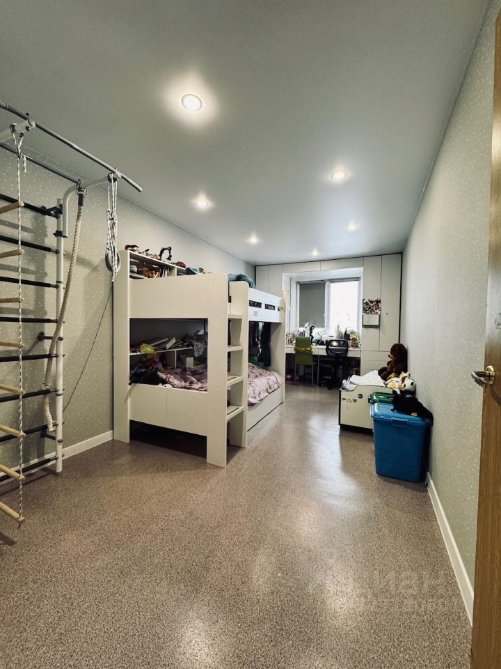 Квартира оборудована встроенной кухней, детской двухъярусной кроватью, школьными столом, стульями, двуспальной кроватью в спальне.
